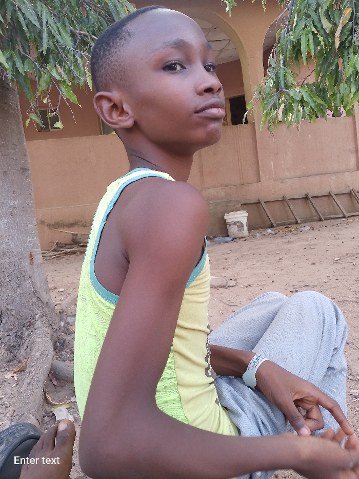A young dark-skinned male is sitting cross-legged in an outdoor, possibly rural, location. He has a close-cropped haircut. He wears a light yellow tank top with a light green trim and light grey pants. A white wristband is on his left wrist. He is next to a tree. In the background is a building with arched windows and a ladder leaning against it. There is a white bucket next to the ladder. Leaves of a tree cover the upper part of the background. A partial foot is visible in the lower-left corner of the frame. A text overlay "Enter text" is on the bottom left of the image.