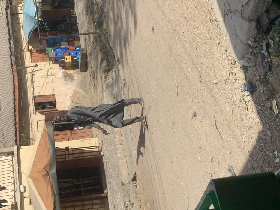 The image displays a street scene in Sabon Gari East, Nigeria, under clear daylight. In the foreground and midground, a light brown unpaved dirt road, intermixed with gravel and debris, is visible. An adult male, of dark complexion, is positioned centrally, captured in a walking motion from left to right. He wears a dark grey long-sleeved tunic over matching trousers and light brown flip-flops. His left arm is bent at the elbow with the hand extended forward, while his right arm is down at his side. A long shadow from the man extends behind him on the ground. In the background, multiple buildings are present. To the left, a faded yellow building features a brown awning over a doorway and a brown door, with a metal railing on an upper level. To the right, another building with a corrugated metal roof has a light blue tarp extended from it. Adjacent to this building, a tall stack of various colored plastic beverage crates, including blue, brown, green, orange, and red, is clearly visible. Overhead, several electrical wires are strung across the scene. A green plastic crate is partially visible in the bottom-left corner, and a concrete curb runs along the bottom-right edge of the frame.