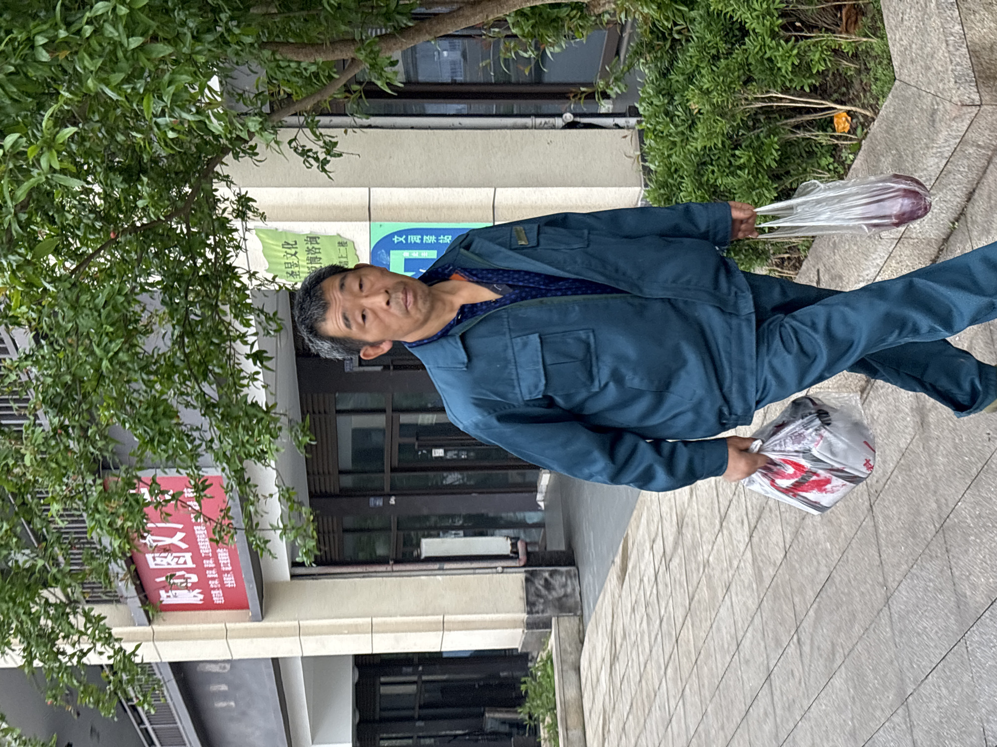 An adult male of East Asian descent walks along a tiled sidewalk in Jiangjin, China, looking directly at the camera. He wears a teal blue work-style jacket with two chest pockets, a dark blue patterned shirt underneath, and matching teal trousers. In his left hand, he carries a clear plastic bag containing items with red markings. In his right hand, he holds another clear plastic bag with a dark red/purple item, possibly a vegetable. The sidewalk consists of light-grey square tiles. Behind him, to the left, is a modern multi-story building with dark glass windows and light-colored pillars. A red sign with white Chinese characters reading "康心图文" (Kang Xin Graphic Design) is visible on an upper floor, partially obscured by green tree foliage. Further right, another sign in white, green, and blue text reads "圣皇文化 辅导咨询" (Sheng Huang Culture Counseling) and "请上二楼" (Please go upstairs to the second floor). A vibrant green tree with small leaves and hints of red fruit occupies the right side of the frame, alongside a green bush and a concrete planter. The lighting suggests overcast daylight conditions.