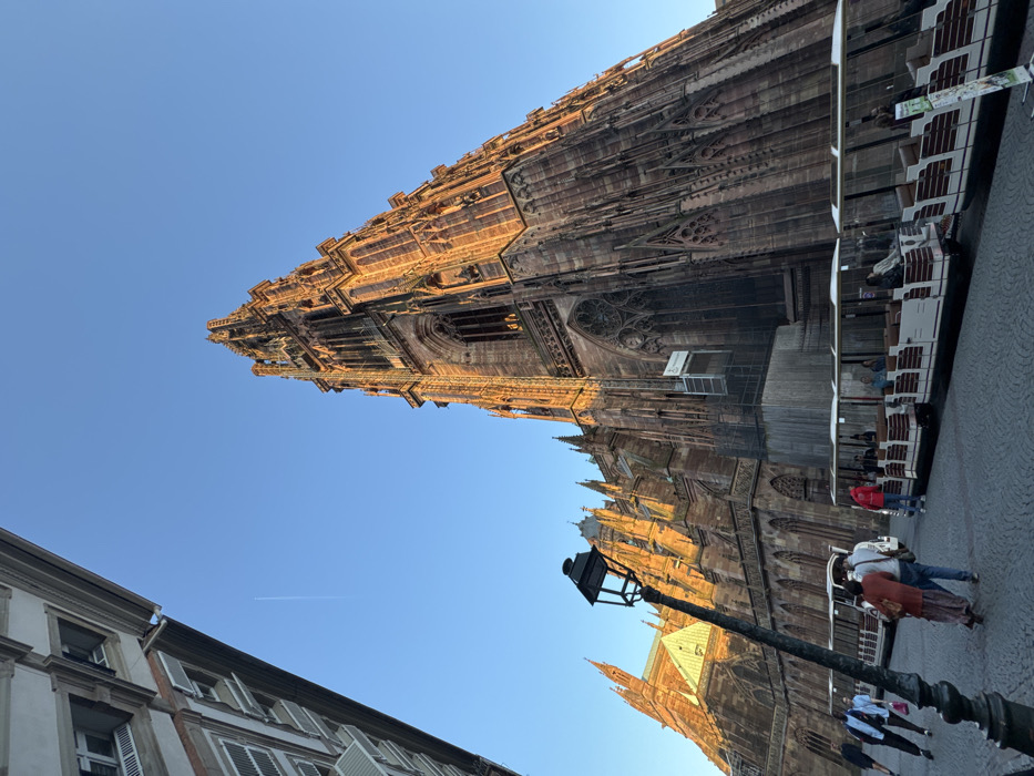The image depicts the towering Strasbourg Cathedral, also known as Cathédrale Notre-Dame de Strasbourg, located in the city center of Strasbourg, France