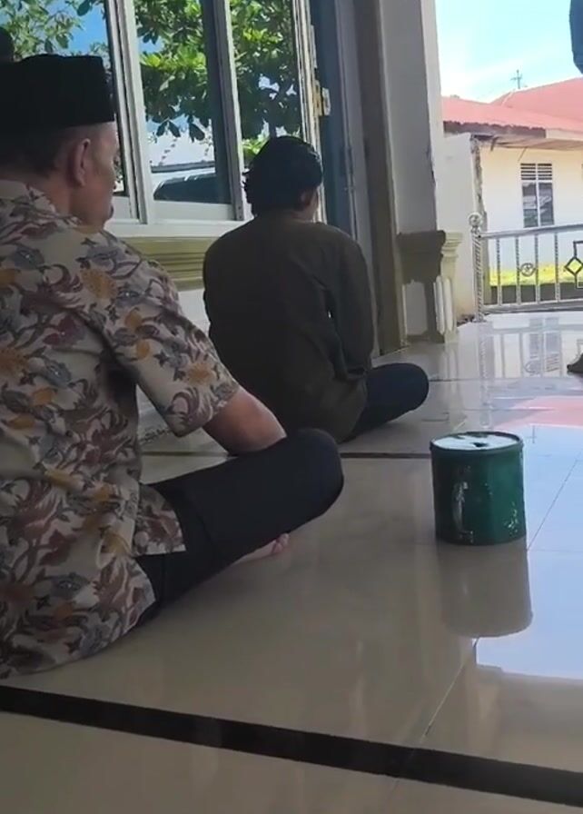 four men on a porch area of a building with shiny tile floors. One man is kneeling on the floor wearing a patterned shirt, black pants, and a black hat. To his right, another man is kneeling on the floor wearing a green shirt and black pants. A green donation can is sitting near the two men. A third man is standing facing the outdoors, wearing a long red sarong, black jacket, and white hat. To the third man's right, a fourth man is kneeling on the floor in a white robe and white hat. The outdoors has a building and trees and a car. A call to prayer is playing in the background.