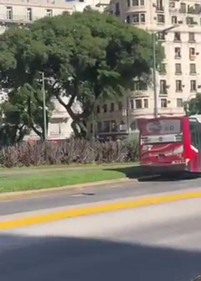 view from inside a moving car in Buenos Aires, Argentina. First, a tall building with "NH HOTELS" on top and a green bus are visible. Then, a group of people are seen walking on a patch of green space, partially obscured by foliage. Next, another building with a dome and glass roof is visible. Finally, the Obelisco de Buenos Aires comes into view, framed by buildings and billboards under a clear blue sky. Traffic and city sounds are audible.
