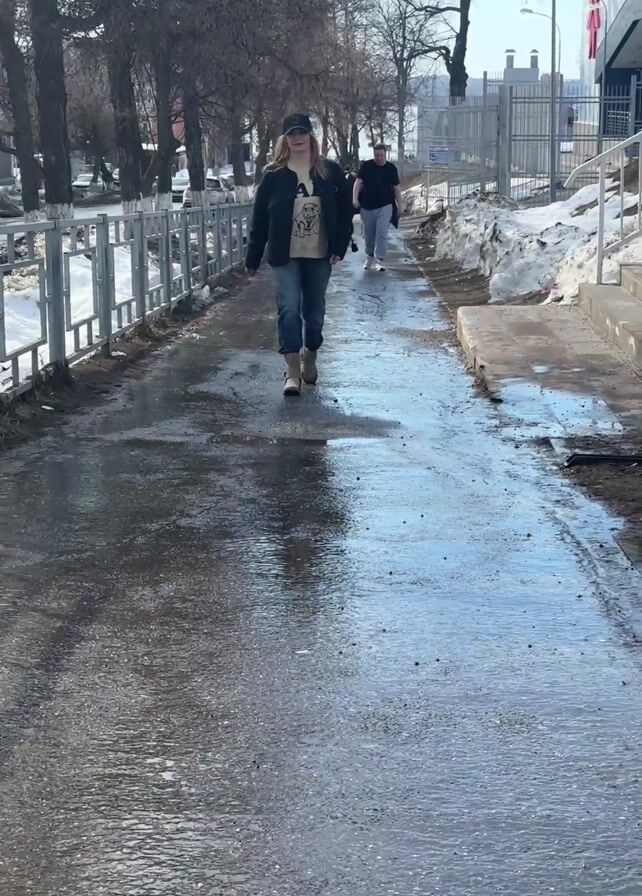 A woman walks towards the camera down a wet, icy sidewalk next to a street. She is wearing a black jacket, a beige shirt with a graphic, blue jeans, and beige boots. She also has a baseball cap on. Another person walks behind her. The sidewalk has a metal railing on one side and steps up to a building on the other. Patches of snow remain on the sides of the sidewalk. Trees line the street, and buildings can be seen in the background. The sky is blue.