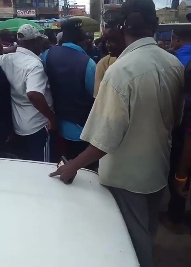 group of people standing around the hood of a white car in what appears to be a busy urban street in Kenya. Buildings are visible in the background, including one with a "DTB" sign and "LINDTECH COLLEGE" written on it. Several men are gathered closely together, with one man in a light green shirt pointing at a phone in his hand, which is resting on the hood of the car. Other men are looking in the same general direction. The overall setting suggests a crowded, possibly tense, situation.