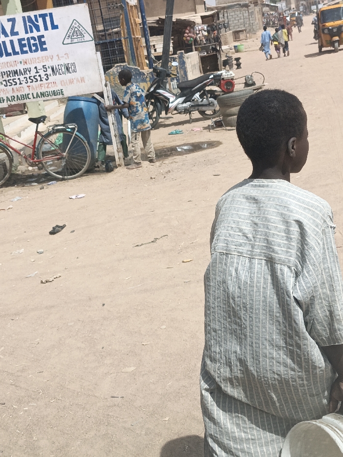 The scene depicts an unpaved street in Hotoro North, Nigeria, under daylight conditions. In the immediate foreground, the back of a young individual, possibly a child, is visible, wearing a light-colored, patterned tunic and holding a white plastic bucket in their right hand. The ground is dry, light brown dirt with scattered debris and faint tire tracks. In the midground, from left to right, a red bicycle with a rear rack leans against a blue plastic barrel. Behind the barrel, a partially obscured individual in blue clothing is visible near the ground. A white sign with blue text, affixed to a utility pole, identifies "AZ INTL COLLEGE" and lists educational programs including "NURSERY 1-3", "PRIMARY 1-5*", "JSS1-3SS1-3", and "ARABIC LANGUAGE". A second young boy, wearing a multi-patterned shirt and light trousers, stands near this pole. To the right, a black and white motorcycle is parked. Behind the motorcycle, a stack of tires and a red generator unit are visible. Two light blue sandals lie on the ground. The background shows the unpaved road extending into the distance, bordered by buildings constructed from light-colored blocks. Multiple pedestrians are visible walking along the road, and a yellow motorized tricycle taxi is present on the far right side of the distant road.