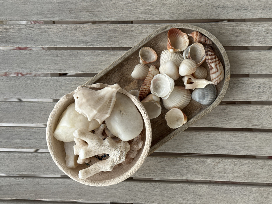 The image displays an overhead view of a static arrangement of marine items and stones situated on a light-toned wooden slatted surface, consistent with an outdoor table, in the city of Anavissos Municipal Unit, Greece. No individuals are visible. A round, light-colored bowl, exhibiting a textured exterior rim, occupies the upper-left section. Its contents consist of several off-white to cream-colored natural objects: a prominent piece of branched coral, multiple smooth, irregularly shaped stones, and a large, pale conch-type seashell. An elongated, oval-shaped wooden tray, darker than the table surface, is positioned beneath and extends to the right of the round bowl. This tray holds a collection of numerous smaller seashells. These shells display varied forms, including bivalves and spiral types, with colors ranging from off-white and cream to light brown, reddish-brown stripes, and a singular greyish-blue bivalve shell. The items appear intentionally organized.