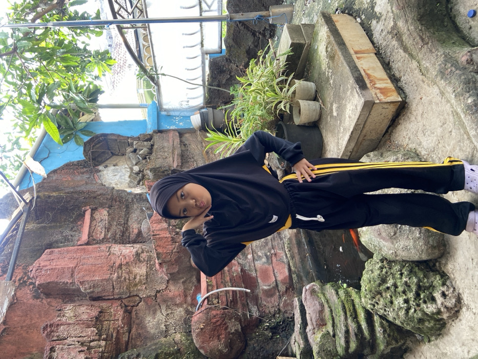 An outdoor, eye-level full-body photograph depicts a young girl posing in a residential setting in Gelam, Indonesia. The subject, a young girl, stands center-frame, dressed in a black hijab, a black long-sleeved top with yellow accents, black track pants featuring yellow double stripes, and light purple Crocs. She has her right hand raised to her temple with fingers curled, and her left hand positioned on her hip, while maintaining direct eye contact with the camera and exhibiting a pouting facial expression. Behind her to the left, an artificial rock-like structure, predominantly reddish-brown and grey, forms a decorative background. At the base of this structure, a small pond contains at least two visible orange koi fish, with a blue hose partially submerged or lying nearby. To the girl's right, multiple potted green plants are arranged on an elevated concrete platform. The ground level consists of irregular concrete paving. In the upper right background, glimpses of green trees and residential structures are visible, alongside a section of a weathered light blue wall and a thin metal support pole.
