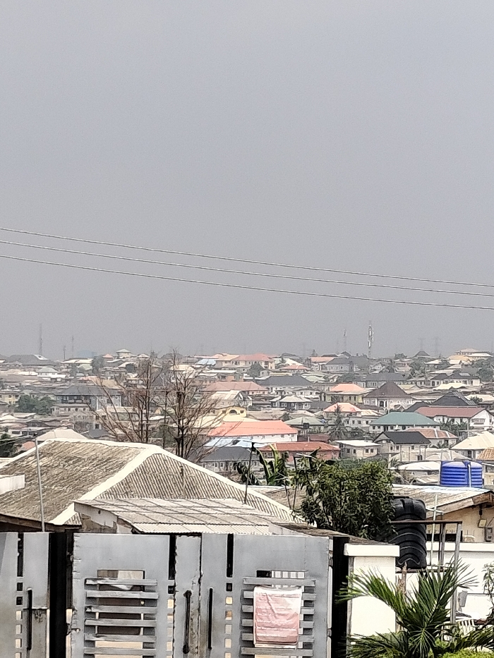 The image depicts an elevated view of a densely populated residential area in Ota, Nigeria, under a hazy, light gray sky