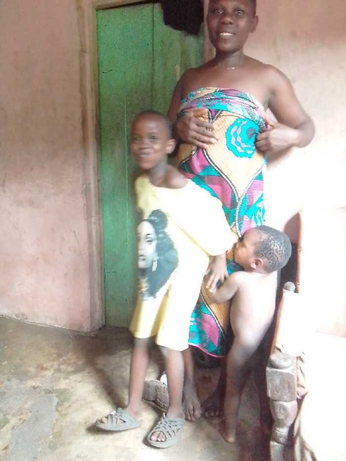 An adult female and two children are depicted standing indoors in Isingwu, Nigeria