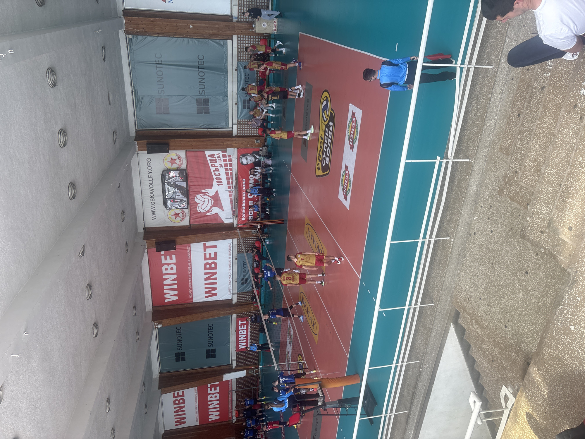 The image depicts a volleyball game in progress indoors, possibly in Sofia, Bulgaria