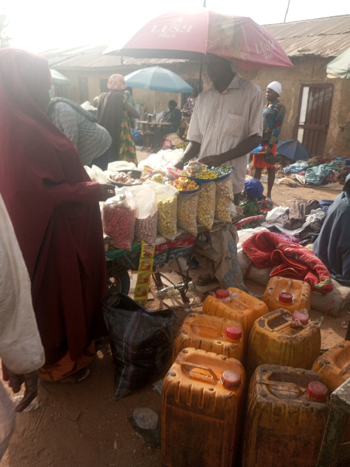 The image depicts an open-air market scene in Kakuri Gwari, Nigeria