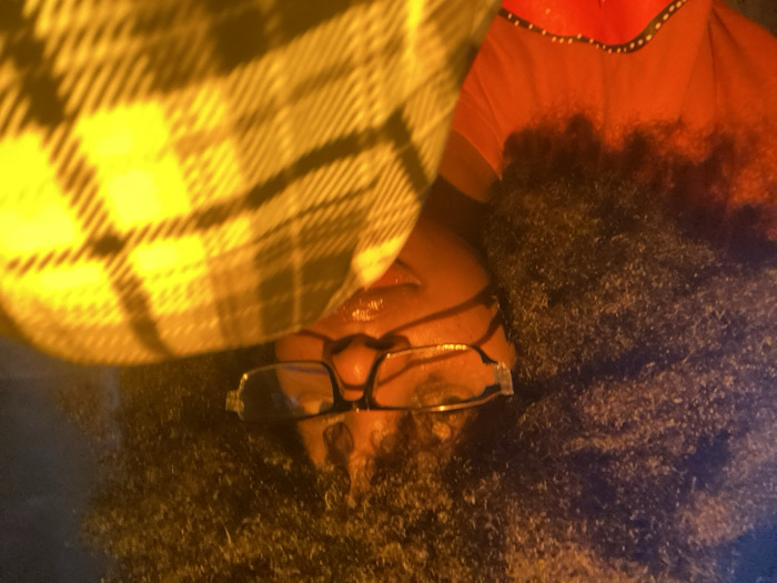 A person with dark skin, glasses, and an afro faces the camera from a low angle. The individual wears an orange shirt with a white polka dot collar. A checkered yellow and white fabric looms above, casting shadows on the forehead. The glasses sit on the nose, partially obscured by the afro, illuminated with yellow light. The setting suggests a nighttime scene with artificial lighting.