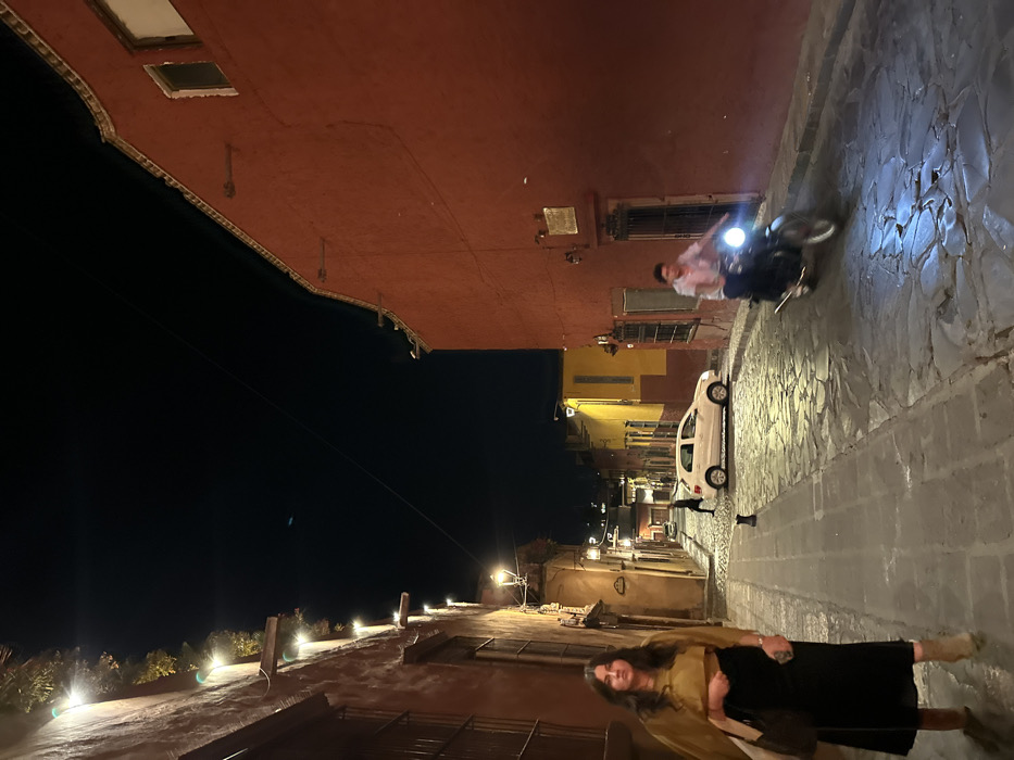 A night shot presents an urban scene with orange buildings bordering cobblestone streets. A woman walks the lower street level, while a man rides a motorcycle on the higher street. A white car is parked nearby. The night sky looms dark above, punctuated by streetlights along the walls and building edges.