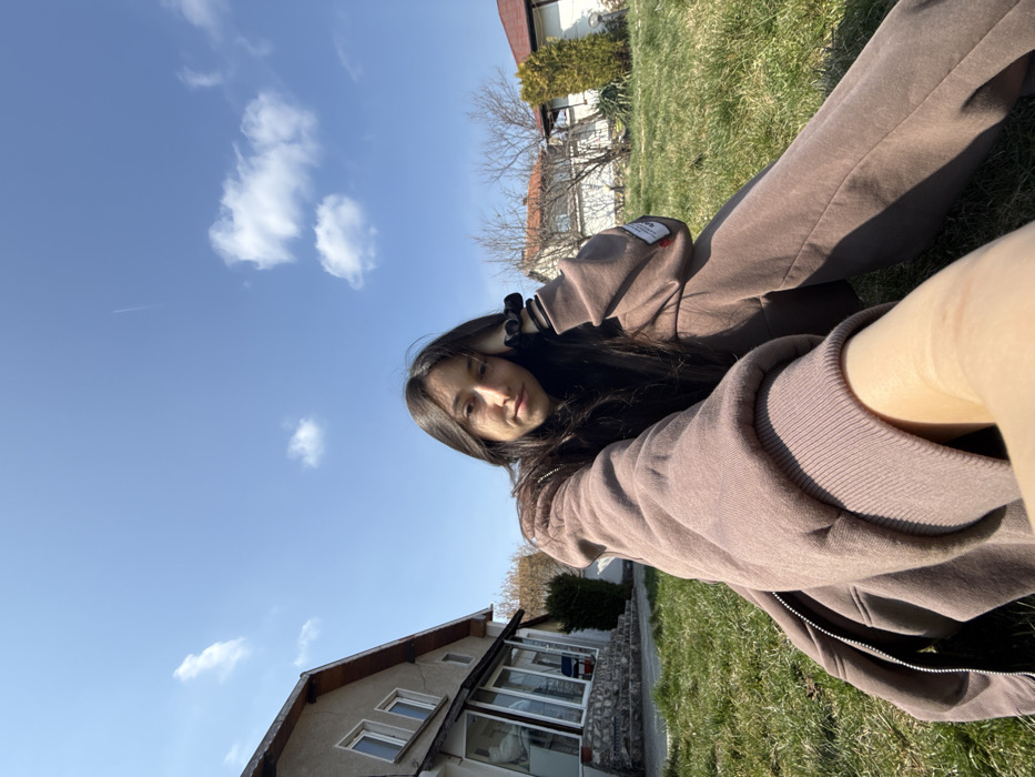 A young female, appearing to be in her late teens or early twenties, is seated on a grassy lawn under bright daylight in Galabovtsi, Bulgaria. She has long, dark brown hair, a neutral facial expression, and is looking directly at the camera. She is wearing a matching, oversized, medium-brown tracksuit consisting of a hooded zipper jacket and sweatpants. Her left arm is extended towards the camera, indicating she is taking a selfie. Her right hand is raised, with fingers near her temple, and a black scrunchie is visible on her right wrist. In the background, to the left, is a two-story residential house with a light-colored facade and a brown-tiled gabled roof. The ground floor features an enclosed sunroom or porch with multiple glass panels, accessible via stone steps. To the right, another house with a reddish-brown tiled roof is partially visible beyond bare deciduous trees and shrubs, suggesting early spring or late winter. A green coniferous bush is visible further right. The sky is clear blue with several scattered white cumulus clouds, and a faint aircraft contrail is visible in the upper right quadrant. The ground is covered in green grass with some drier patches.