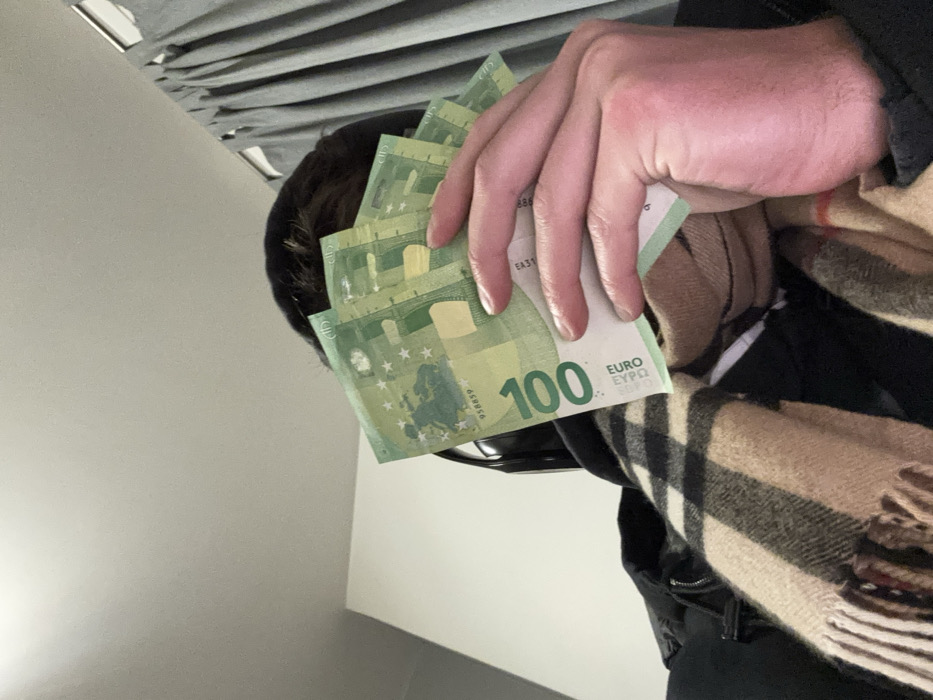 A low-angle shot reveals a person holding several €100 Euro bills in their hand