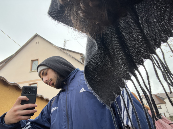 The image captures a low-angle perspective of a young man holding a smartphone in Meistratzheim, France, under an overcast sky