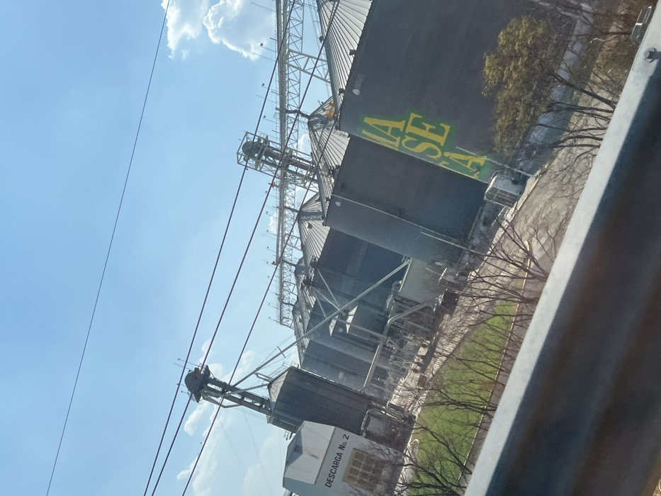 A view of a grain elevator complex, featuring tall, dark silos with steel support structures against a clear blue sky with scattered clouds. Green and yellow lettering is visible on one silo. Power lines cross the frame. Adjacent to the silos is a small building marked "DESCARGA No. 2." Grass and trees are on one side of the silos. A gray object appears partially in the right foreground, possibly part of a window or structure from where the photo was taken.