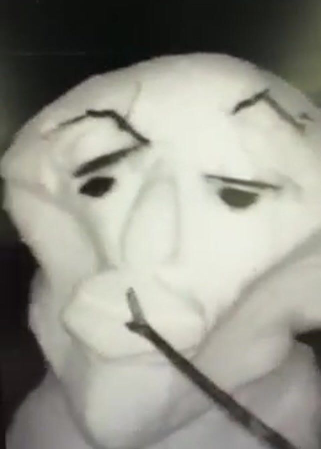 close-up view of a crudely sculpted snow head against a dark background. The head has exaggerated facial features, with twig-like eyebrows, dark, rounded eyes, a large nose, and thick lips. A thin stick is seen near the head's mouth. The camera moves slightly, altering the angle of the view. The screen's edge is visible.