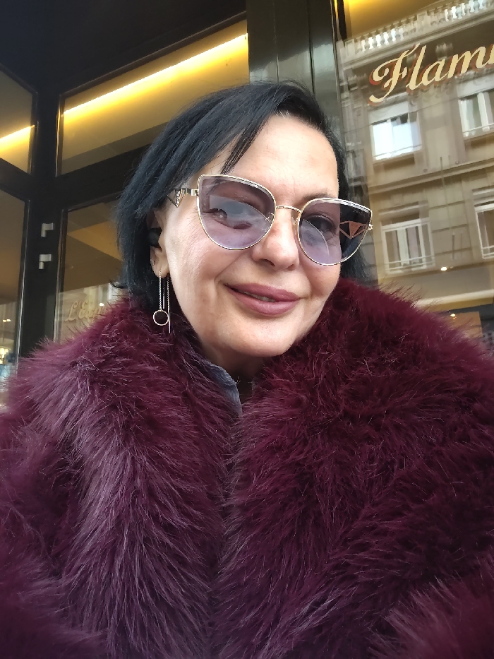 A middle-aged woman is depicted in a close-up, chest-up portrait. She has short, dark hair, light-toned skin, and a subtle smile. She wears gold-framed, cat-eye style sunglasses with purple-tinted lenses, a dark earbud in her left ear, and a dangling gold-toned earring featuring a small hoop and a vertical bar. Her lips are made up with a plum-colored lipstick. She is wearing a voluminous, dark burgundy faux fur coat, with the collar of a light blue denim shirt visible beneath it. The background consists of reflections in large glass windows. To her left, a dark doorway or window reflects a warm yellow light strip and a partial word "L'Eu..." or "L'Or...". To her right, a large window prominently displays "Flamme" and partially "L'Origine" in decorative script, indicating the establishment "La Flam' L'Origine." Reflected in this window is also part of an adjacent building facade with multiple windows and light-colored stone. The scene is located in Strasbourg, France, specifically outside "La Flam' L'Origine."
