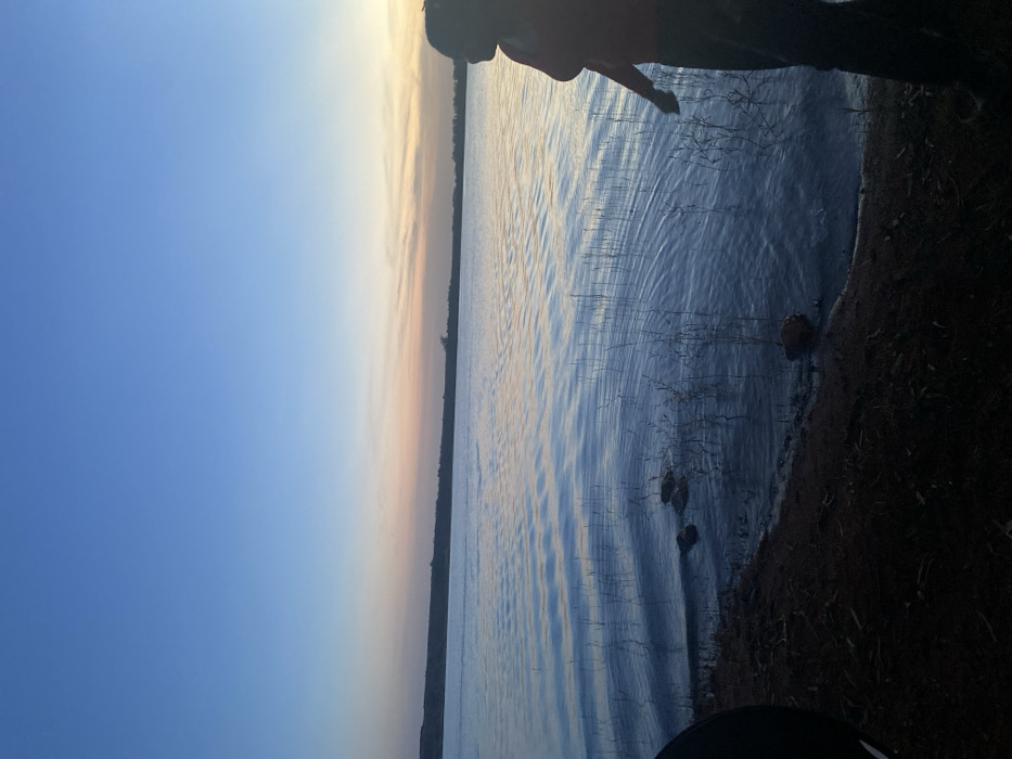 The image depicts a large body of water, likely a reservoir or lake, situated in Jos, Nigeria, at either dawn or dusk. The upper half of the frame shows a gradient sky, transitioning from deep blue overhead to lighter blue, then orange and pink hues near the distant horizon line. A dark, low-lying landmass or shoreline is visible on the far horizon, bordering the water. The water surface exhibits gentle ripples, reflecting the sky's colors, appearing light blue with streaks of orange/pink. In the immediate foreground, a dark, reddish-brown earthen bank slopes down to meet the water. Several dark, smooth rocks are partially submerged in the shallow water near the shore, interspersed with thin, upright aquatic vegetation resembling reeds or grasses. On the far right, an individual is partially visible, silhouetted against the lighter water and sky. The person appears to be an adult, wearing a dark-red top and dark trousers, standing at the water's edge, facing leftward towards the expanse of water. Their left arm is visible, hanging by their side. A dark, circular object is partially visible on the far left side of the frame, possibly part of another person or equipment close to the camera.