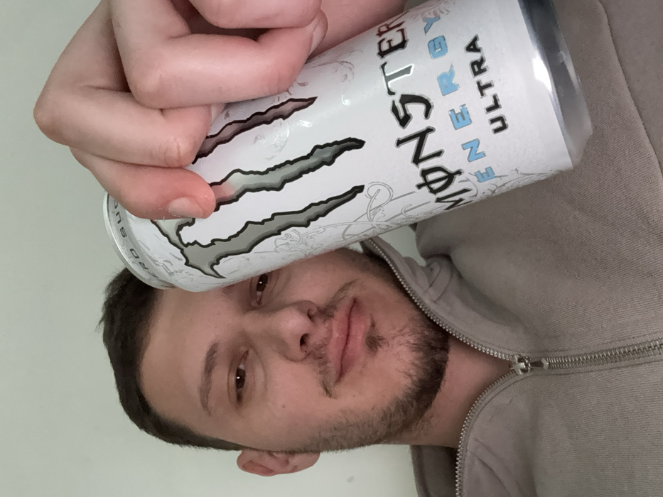 A male individual, estimated to be in his 20s or early 30s, is depicted in a close-up, upward-angled photograph, consistent with a selfie. He has short dark hair, light brown eyes, and stubble on his chin and upper lip. He wears a light beige or grey quarter-zip garment. The subject holds a white Monster Energy Ultra beverage can in his left hand, visible to the right of his face. The can displays the black Monster 'M' claw logo, 'ZERO SUGAR' text, and 'MONSTER ENERGY ULTRA' in light blue lettering; condensation is present on its surface. The subject's gaze is directed towards the camera, and his lips are slightly pursed. The background is a plain, light-colored wall, providing no specific environmental details. The exact location within Sofia, Bulgaria, is not discernible from the image.