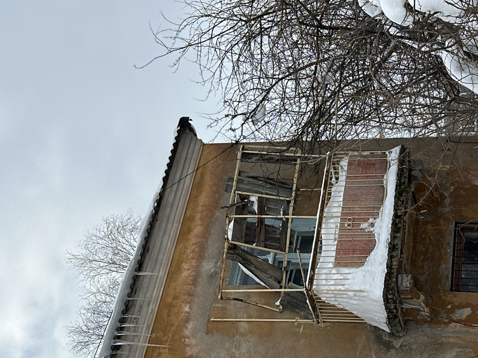 An exterior forensic image depicts a section of a dilapidated, multi-story building in Perm, Russia, under overcast winter conditions. The building's facade is characterized by peeling, faded yellow-brown stucco. The corrugated metal roof edge is heavily laden with snow and features numerous icicles hanging prominently. A slender wire or cable extends downwards from the roofline. Below the roof, a recessed upper-level opening, possibly a former balcony or window, is visible. This opening is enclosed by a rusted, light-colored metal framework and extensively boarded up with various weathered wooden planks and debris, through which a light blue window frame is discernible. Directly beneath this upper section, a concrete balcony protrudes, its surface completely covered by a substantial layer of snow. The balcony is secured by a white, rusted metal railing, behind which a reddish-brown, corrugated panel is partially visible. A lower-level window with dark frames and security bars is partially visible below the balcony. To the right of the building, the bare, thorny branches of a deciduous tree, partially covered in snow, extend into the frame against a uniform, light grey sky. No individuals or active interactions are present in the scene.