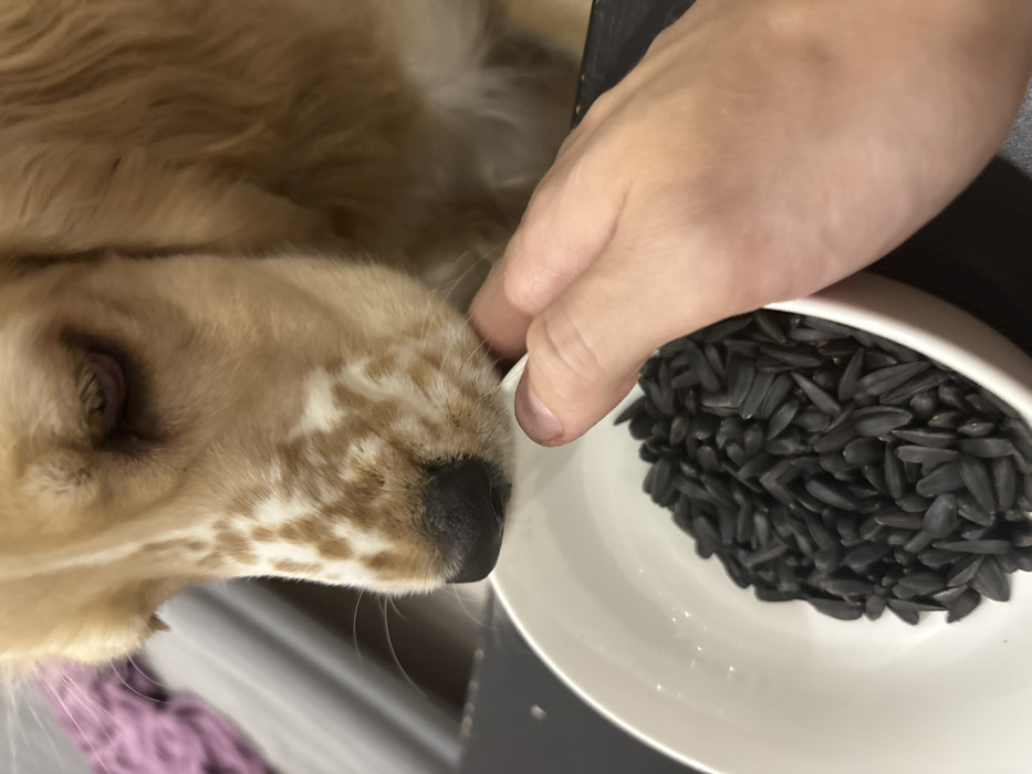 - "The image displays a close-up, indoor scene in Saint Petersburg, Russia, focusing on a light-colored dog, a human hand, and a bowl of sunflower seeds" by FM-ARrGE2, licensed under CC BY 4.0