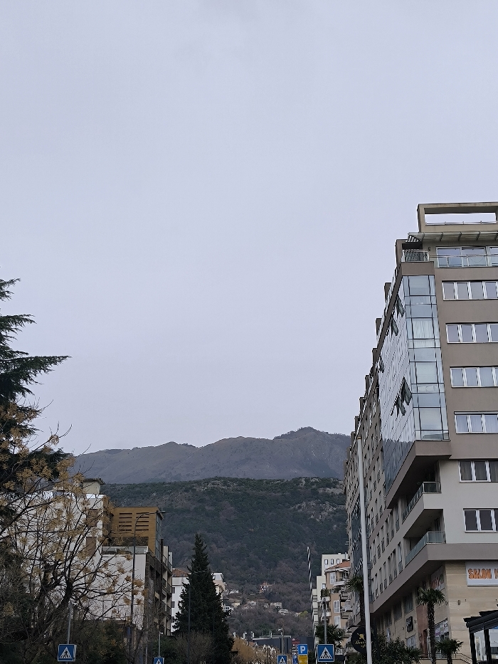 The image depicts an urban street scene in the city of Unknown, Unknown, under an overcast, light grey sky. A rugged, forested mountain range dominates the distant background, with some areas of exposed rock or sparse vegetation. In the foreground, the left side features dense evergreen foliage partially obscuring bare deciduous tree branches. A white multi-story building is visible behind these trees, with a brown upper section. At the bottom left, a blue square pedestrian crossing sign is positioned. The right side of the frame is occupied by a modern, multi-story building constructed of light beige material with extensive glass facades. Several windows on this building are partially open, tilted inwards. Balconies are present on lower floors. A commercial sign with orange lettering, partially reading "SALON H", is visible at ground level. Two palm trees stand in front of this building. A vertical pole, possibly a street light, runs along the right side of the road. The center of the image shows a street or roadway extending towards the mountains. Another blue square pedestrian crossing sign and a blue "P" parking sign are visible in the lower center. A dark green conifer tree stands in the middle ground, separating the road from other buildings further down the street. No individuals or moving vehicles are discernible in the scene.