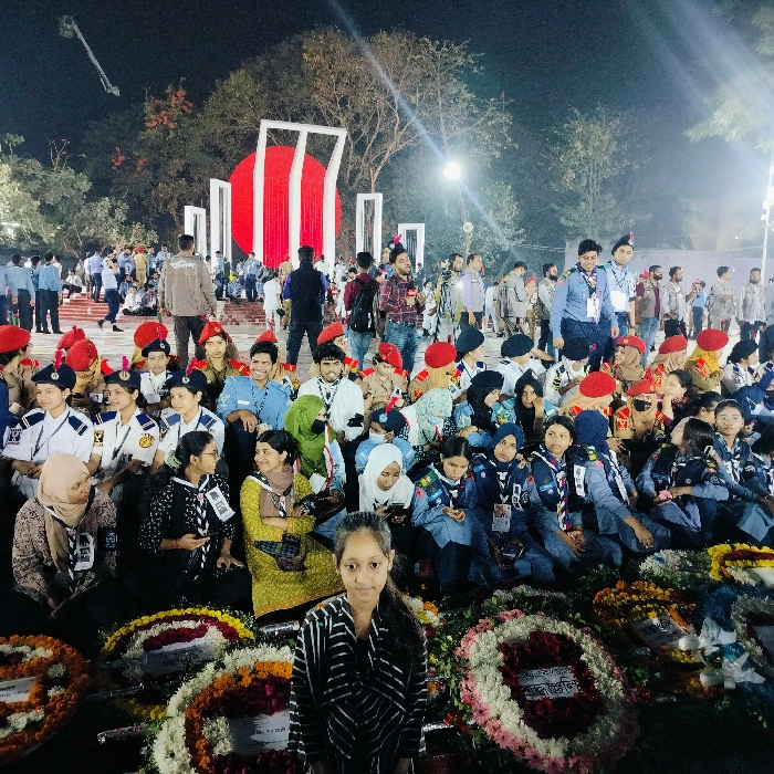 A crowd gathers near a monument with a red circle, possibly for a ceremony. Many appear to be students or scouts, wearing uniforms and some with hats. Wreaths are prominently displayed in the foreground, suggesting a memorial or commemorative event. People mill around, and the atmosphere seems orderly, perhaps during a national holiday or significant anniversary.