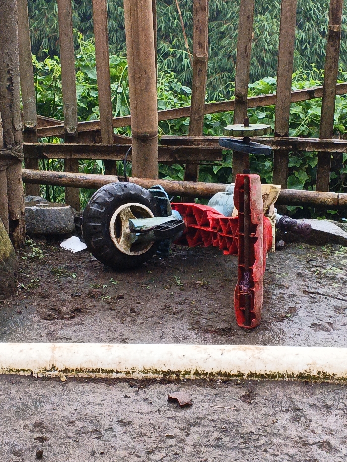 A red and black toy tricycle sits in muddy ground. Its black tire and worn red plastic parts are visible. Behind it, a crude bamboo fence provides a backdrop. A white pipe lies on the lower portion of the frame. The ground is wet and textured. The background greenery is dense and blurred.
