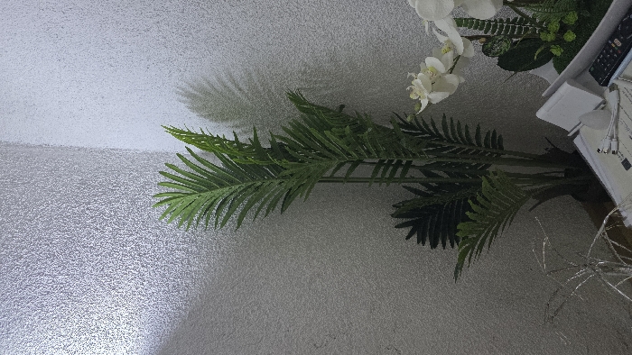 The image captures an indoor scene in the city of Belitsa, Bulgaria, specifically a room corner featuring light gray, textured walls. A tall, artificial palm-like plant with multiple green fronds stands in the corner, casting a distinct shadow on the right wall from an unseen light source to the left. To the immediate right of the palm-like plant, a decorative arrangement of artificial white orchids with green leaves is displayed within a white planter. On a surface below these plants, several items are arranged: a stack of white documents or papers, a small white electronic device or stand, a multi-headed charging cable (USB-C, Micro-USB, Lightning), and a black remote control. A silver, wire-like decorative object is partially visible on the lower left of the surface. No individuals, actions, or interactions are present.