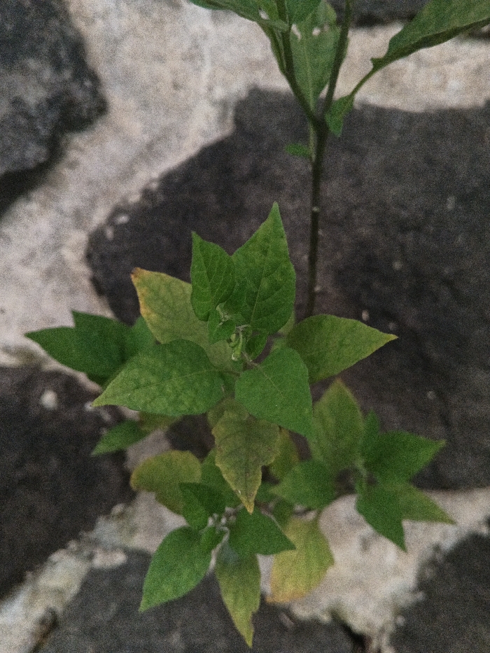 The image displays a close-up, overhead view of a small plant growing in Candelaria, Philippines. The plant possesses a slender central stem and numerous green leaves, with some lower leaves exhibiting a yellowish-green discoloration. It is positioned against a background constructed from rough, irregularly shaped blocks or stones, which vary in color from dark grey to light grey/off-white. Visible gaps exist between these blocks. No individuals, additional objects, or active interactions are present in the scene.