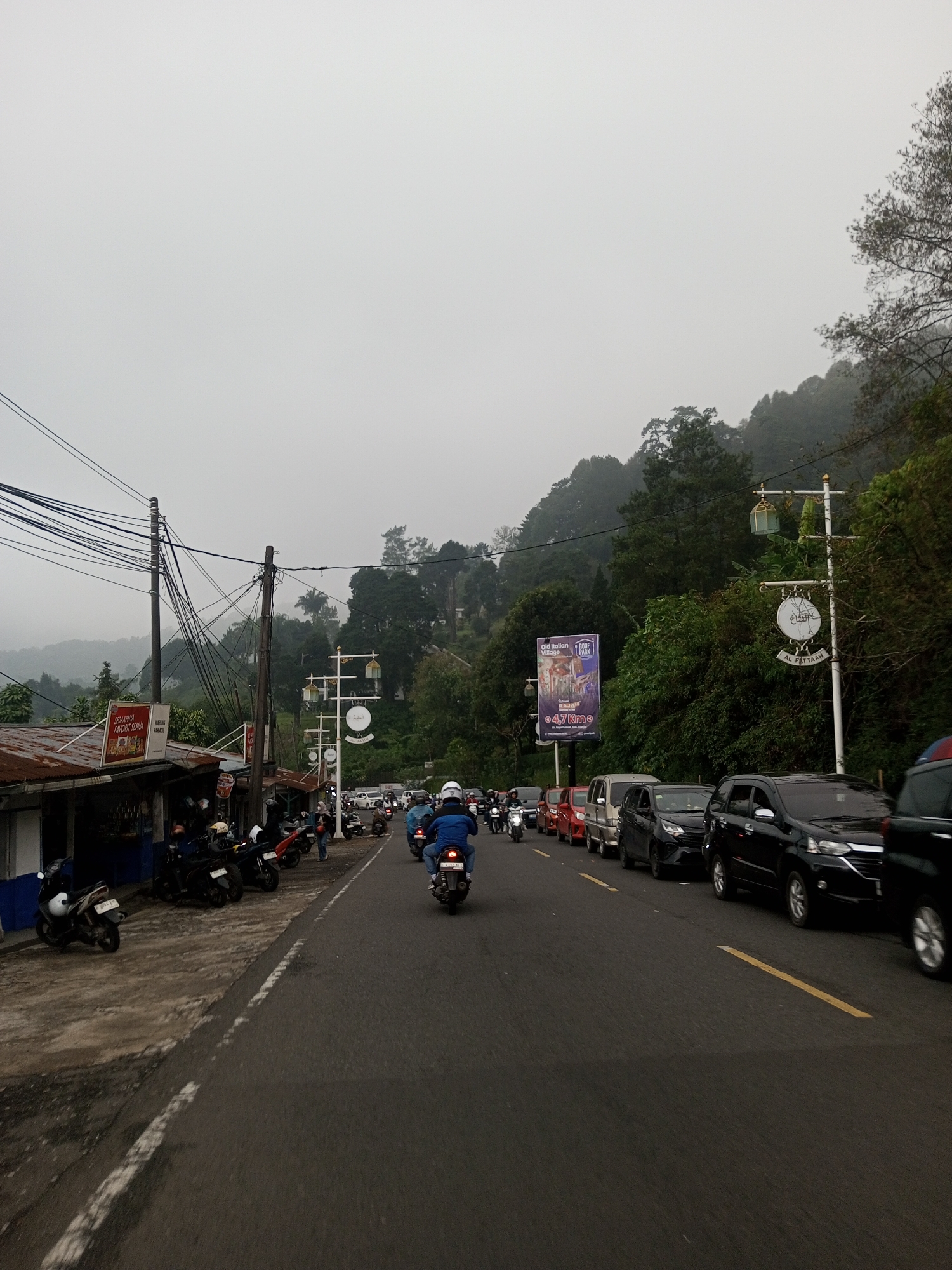 street in the Mae Chan District, Thailand. The sky is overcast. The road is congested with a line of cars and motorcycles moving slowly. Some motorcycles are parked on the side of the road, near a small shop with signage in an Asian language. Power lines are visible above the shop. The road is surrounded by lush green vegetation and trees on the right, sloping uphill. Signposts and advertising billboards are interspersed along the roadside.
