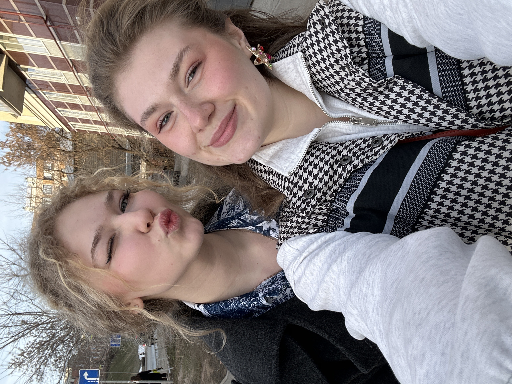 The image depicts two young Caucasian females taking a selfie in an urban street environment in Kazan, Russia. The female on the left, with curly blonde hair, is winking her right eye and pouting her lips. She is wearing a dark outer garment over a blue and white patterned shirt. The female on the right, with brownish-blonde hair, is smiling and looking at the camera. She is wearing a black and white houndstooth patterned vest over a light grey zippered hoodie and has a prominent multi-colored, star-shaped earring on her right ear. In the background on the left, a sidewalk or dirt path borders a street where a distant pedestrian in dark clothing is visible, along with a partially obscured parked vehicle. A blue road sign displaying a white arrow pointing right, with a smaller blue rectangular sign beneath it, stands beside bare deciduous trees, indicating a colder season. On the right, a multi-story building constructed of red or brown brick features numerous white-framed windows, distinctive light-colored horizontal architectural trim, and a partial balcony structure on an upper floor. The sky overhead is overcast and light blue, indicating daytime conditions.