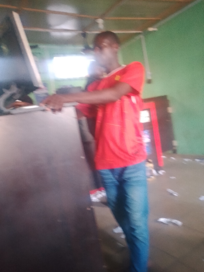 Inside a cluttered room, a dark-skinned man stands near a dark cabinet