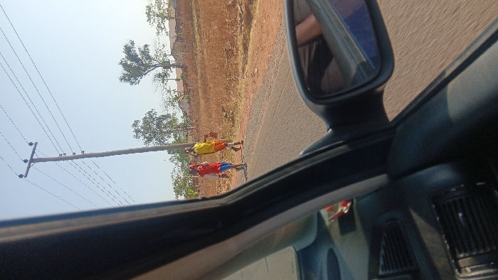 A road is viewed from inside a car, with a side mirror visible. On the road's edge, two individuals in colorful attire are walking. Behind them, a grassy area slopes upward with scattered trees and buildings. Power lines stretch across the sky adjacent to one of the trees. The perspective is slightly skewed due to the car's angle. The car's dashboard and interior are partially visible.