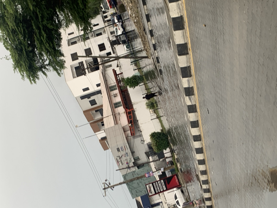 The image presents a tilted, forensic view of a flooded street and its immediate surroundings in Alaguntan, Nigeria, under an overcast sky