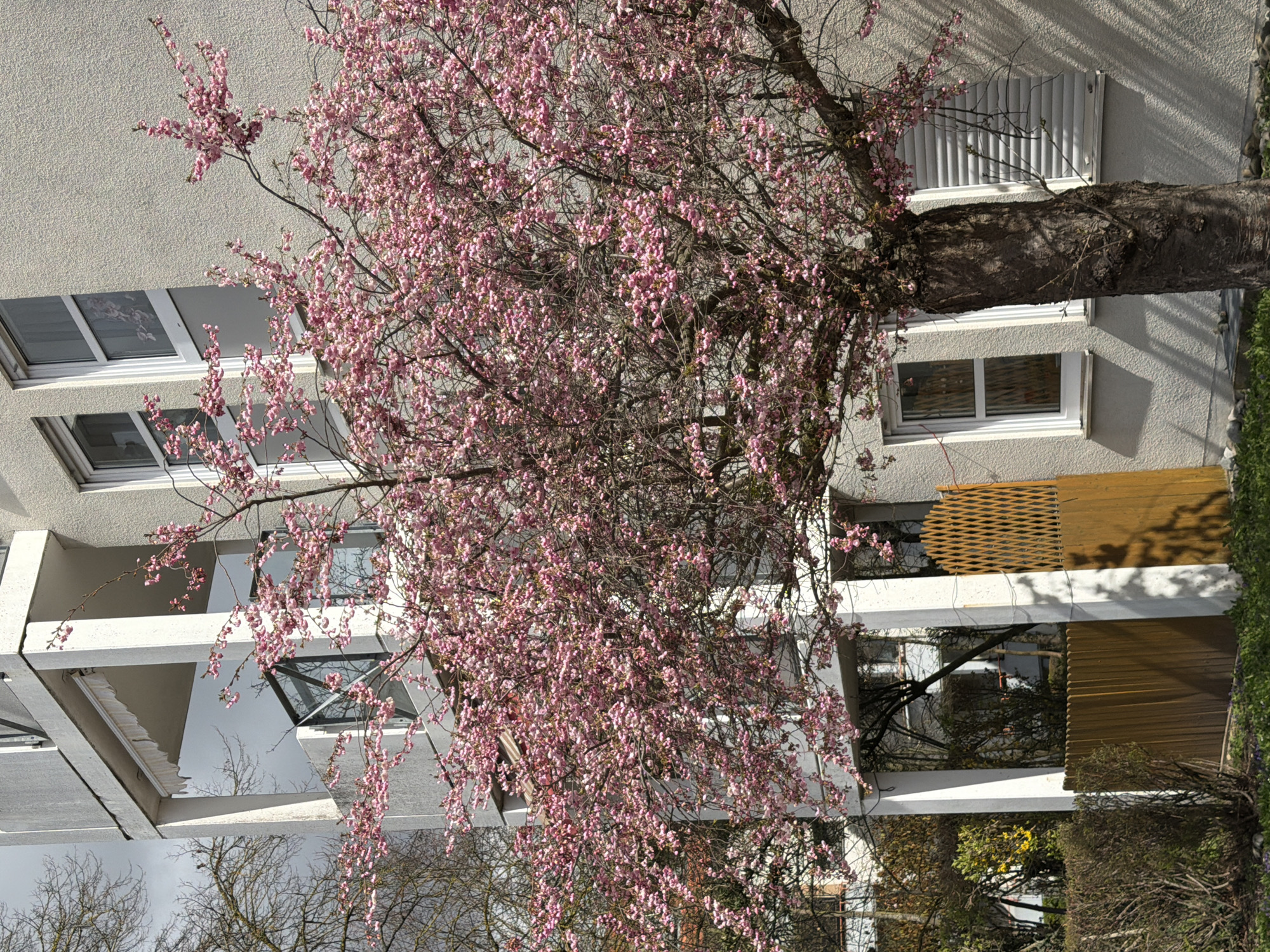 pink flowering tree in front of a building in Ulm, Germany. The building is multi-storied with white window frames and balconies. Some windows have blinds. There is foliage visible below the building and other trees are apparent in the distance.