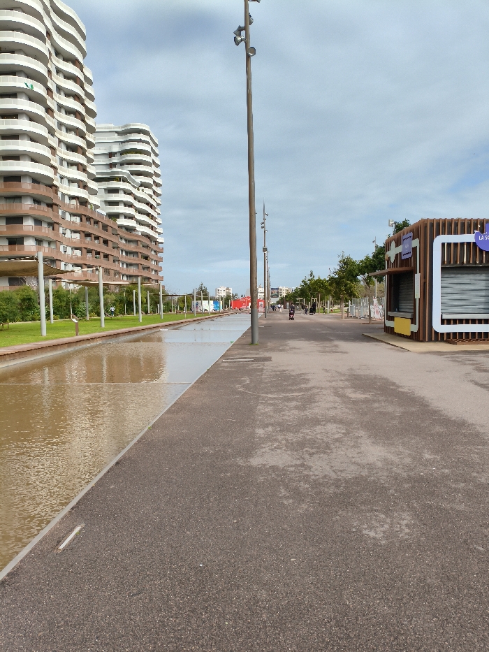 A walkway alongside a shallow, muddy water feature leads to distant figures. Modern apartment buildings with tiered balconies dominate the left. Tall metal poles stand along the path. A wooden structure with purple signage sits to the right. The walkway surface is dark and textured. The sky is overcast.