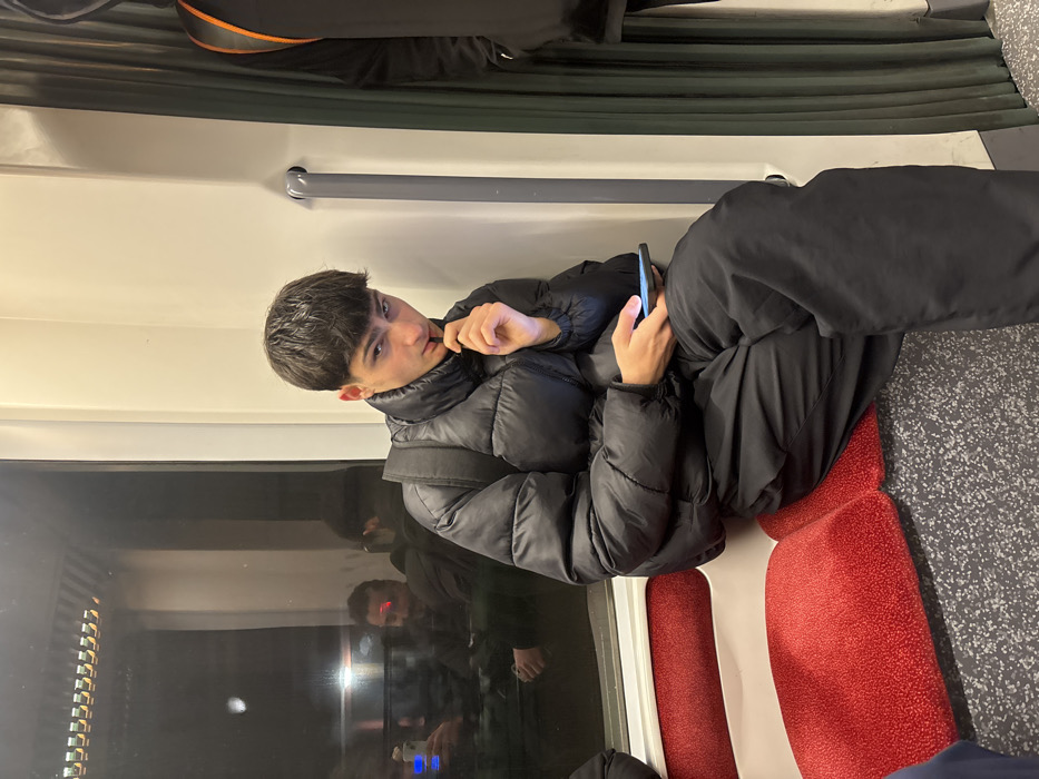 - "Inside a public transport vehicle, likely a tram or train, in a city in Hoenheim, France, a young male is seated on a red upholstered seat" by FM-DELcs2, licensed under CC BY 4.0