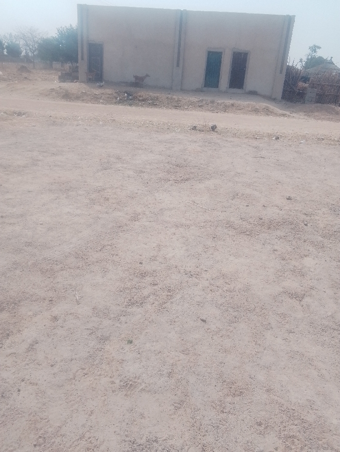 The image depicts a dry, unpaved dirt road or open ground area within Kanwa, Nigeria, under a hazy sky