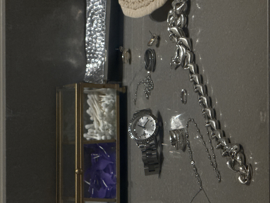 The scene depicts a collection of personal effects and jewelry laid out on a dark grey, reflective surface, likely a vanity or dresser, within an indoor setting in Mexico City, Mexico
