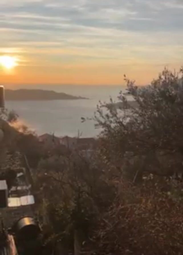 The video depicts a landscape view overlooking a body of water, presumably a sea or bay, during a sunset or sunrise. The sun is low in the sky, casting a warm orange glow across the water and the horizon. Silhouettes of islands or land masses are visible in the distance. In the foreground, there are trees and shrubs, along with parts of a building, including pipes and possibly a satellite dish. Some houses are visible in the middle distance. The sky is lightly clouded, and the overall atmosphere is calm and serene. The video appears to be shot from an elevated position, possibly a hillside or upper floor of a building.