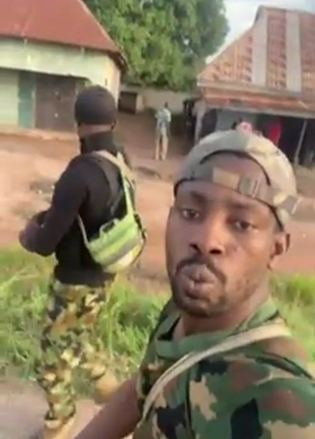 man in camouflage clothing taking a selfie video, in what appears to be a rural area. He is wearing a camouflage baseball cap and a light-colored shoulder strap. Behind him, another person in camouflage pants and a black shirt walks away. In the background, there are buildings, and a group of people near one building. There is also some green vegetation. The sky is overcast. There are audible sounds that appear to be shouting or gunfire.