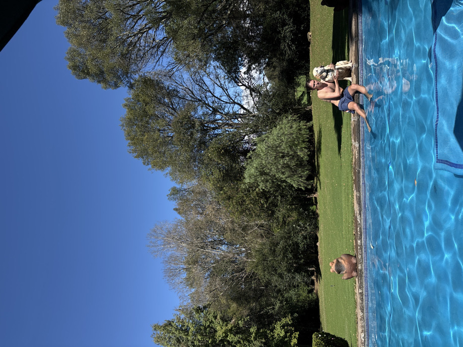 - "The image depicts an outdoor scene in Huasca de Ocampo, Mexico, featuring a male and a dog positioned beside a swimming pool under a clear blue sky" by FM-LuzOX2, licensed under CC BY 4.0
