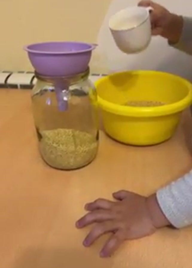 A child is pouring yellow seeds from a white and purple cup into a purple funnel placed atop a glass jar. The jar is partially filled with the same seeds. To the right of the jar is a yellow bowl containing more of the seeds. The child's hand is visible on the light brown surface of the table. The background is a light beige wall.