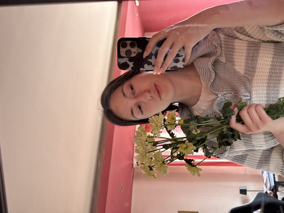 A young female subject is depicted taking a mirror selfie indoors in Galabovtsi, Bulgaria. She has dark hair and is wearing a light-colored base shirt beneath a grey and off-white striped knitted sweater with a prominent collar and a silver zipper detail. Her left hand (visible on the right) holds a black smartphone encased in a cow-print cover, angled towards the reflective surface. Her fingernails are light-colored. Her right hand (visible on the left) holds a bouquet of approximately ten yellow chrysanthemum-like flowers with green stems and leaves. The background, reflected in the mirror, shows a room with light pink walls and a white ceiling. A horizontal beam or border, painted a vibrant red or magenta, runs across the upper wall. Faint background details include what appears to be a dark chair or furniture piece with a small dark lamp and papers on a table, and to the left, a framed item on the wall and vertical elements possibly indicating a window with red and white striped curtains or a doorframe.
