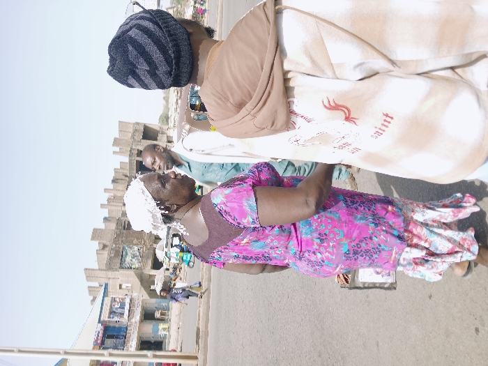 The image depicts a street scene in Mumbwa, Zambia, under clear daylight conditions. In the immediate foreground, to the right, a person with dark skin is seen from the back and right side. This individual wears a black and gray striped knitted beanie and a light brown hooded sweatshirt with a white graphic on the back, featuring a stylized animal figure with red accents and the word "saint" in white. A dark beard is visible. To the left of the foreground, an adult woman with dark skin is shown in profile, facing left. She wears a white, possibly crocheted or beaded, head covering. Her attire consists of a short-sleeved top with a dark purple upper section and a vibrant pink, blue, and black floral or abstract pattern, paired with a light-colored, possibly white and pink, floral patterned skirt with a ruffled hem. She holds a dark object in her left hand. Further back, between the two foreground subjects, a man with dark skin is partially visible, oriented towards the right. He wears a light-colored long-sleeved shirt over a green or teal undershirt. The subjects are standing on a paved surface. In the background, on the left, a two-story building with a light-colored facade and blue window frames is visible, appearing to house shops on the ground floor. Across the street, a large, multi-story concrete structure, possibly unfinished or in disrepair, dominates the view, characterized by angular forms and exposed construction elements. A large poster or mural is visible on one section of this structure. The street also features several pedestrians and multiple three-wheeled vehicles, resembling tuk-tuks. The sky is clear, indicating bright weather. No explicit interaction is observed between the foreground individuals; they appear to be present in a public thoroughfare.