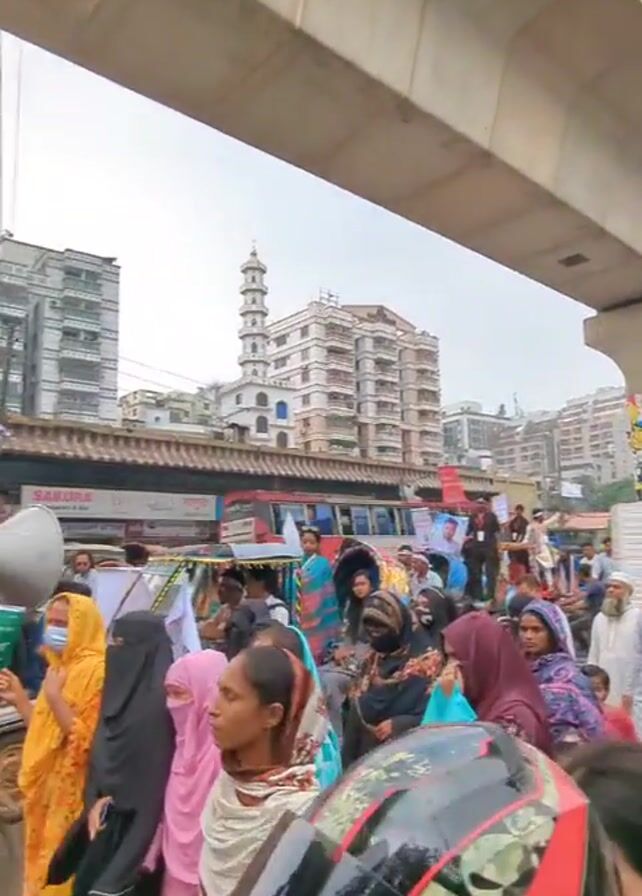 large crowd of people gathered in a city street, likely engaged in a protest or demonstration. The majority of the people appear to be women, many wearing hijabs of varying colors. Several are also wearing traditional South Asian clothing. The crowd is dense and moving forward, with some individuals carrying flags and signs. A man on a bicycle with a loudspeaker leads the group. The scene unfolds underneath an elevated train track infrastructure, with urban buildings and a mosque minaret visible in the background. Traffic signals and posters are affixed to the elevated pillars. A man wearing a motorcycle helmet is visible in the foreground. The overall atmosphere suggests a sense of active civic engagement or political expression.