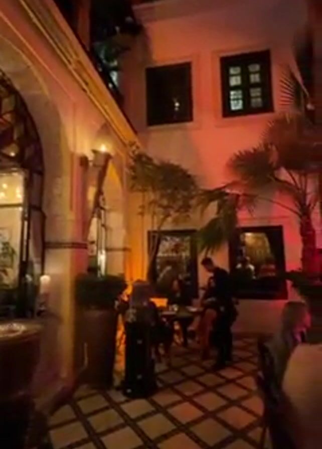 courtyard of "Le Grand Arabe" restaurant at night. The courtyard has a checkered tile floor, a small pool with floating lights, and several tables where people are dining. There are palm trees and other plants around the courtyard. In the background, a band is playing music under an arched entrance. The restaurant building is white with dark windows and arched doorways, and the courtyard is lit with warm, orange lighting. Several servers in dark uniforms are attending to the diners.